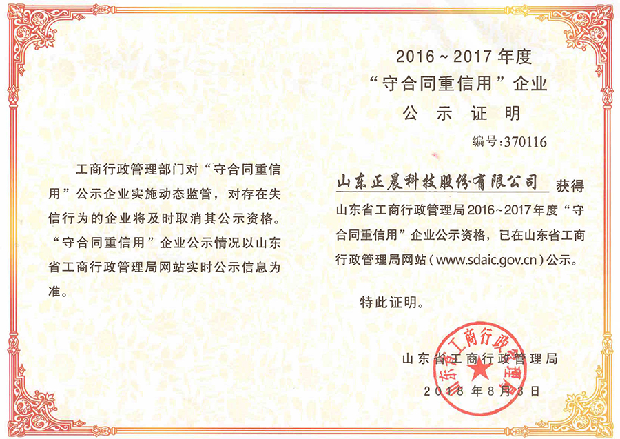 近日,山东正晨科技股份有限公司荣获2016-2017年度山东省工商行政管理局“守合同重信用”誉称号和济南市工商行政管理局“守合同重信用”荣誉称号,这正晨股份自2009年起连续年获此殊荣。